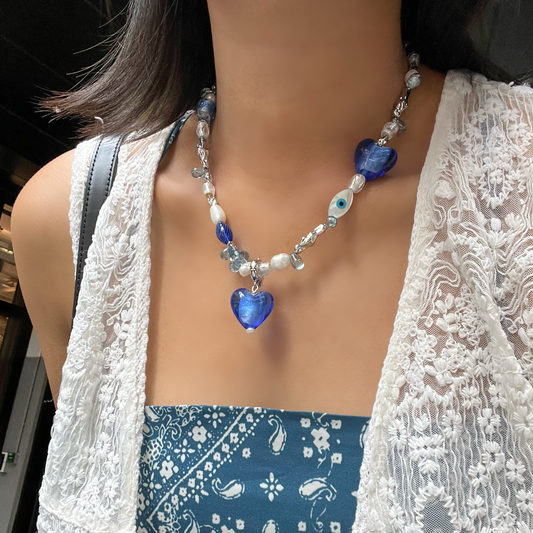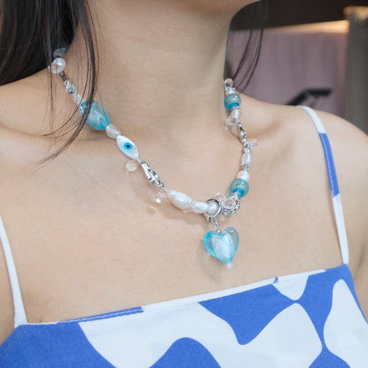 [ PLAYFUL ] 科幻感 冰藍心與惡魔之眼 銀色熔岩 淡水珍珠 頸鏈 CHOKER C137-light blue