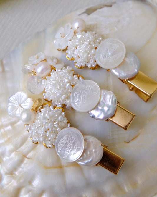 繡球花 淡水珍珠 貝母 髮夾 H129