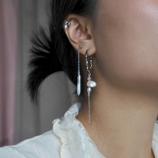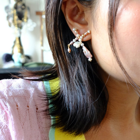 銀灰色 粉紫色 不規則的巴洛克淡水珍珠 4件套 耳環 E357