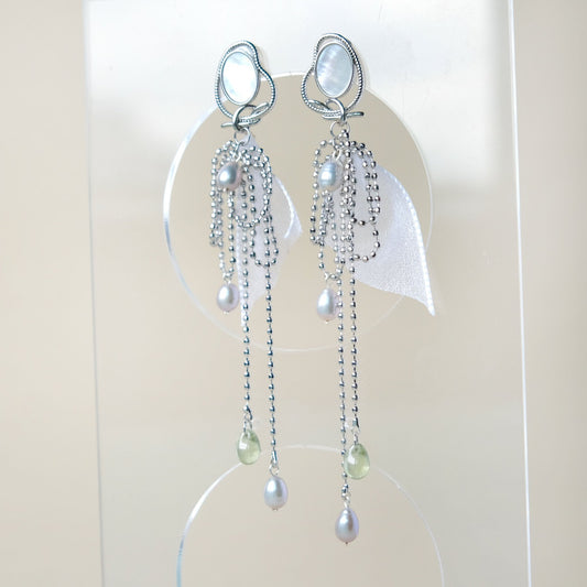 靈動感 流蘇 銀灰色淡水珍珠 貝母 綠色琉璃珠 耳環 E359