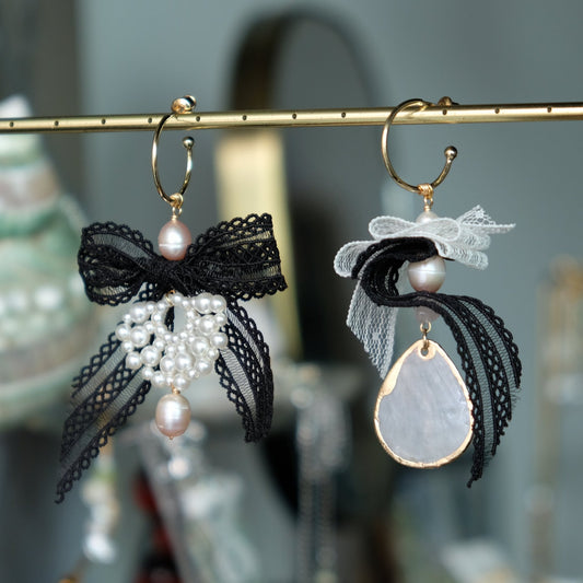 การลดราคา浪漫 蕾絲 蝴蝶結 串珠 粉紅淡水珍珠 貝母 不對稱 耳環 耳夾 E360
