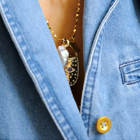 [ Good Luck ] 惡魔之眼鎖扣 黑色鋯石十字架 巴洛克淡水珍珠 鈦鋼頸鏈 N176