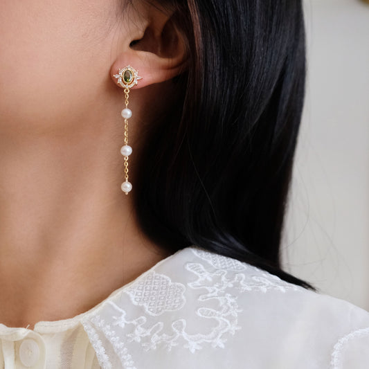 精緻復古花環 橄欖綠色 淡水珍珠 925純銀耳針 不對稱耳環 耳夾 E361