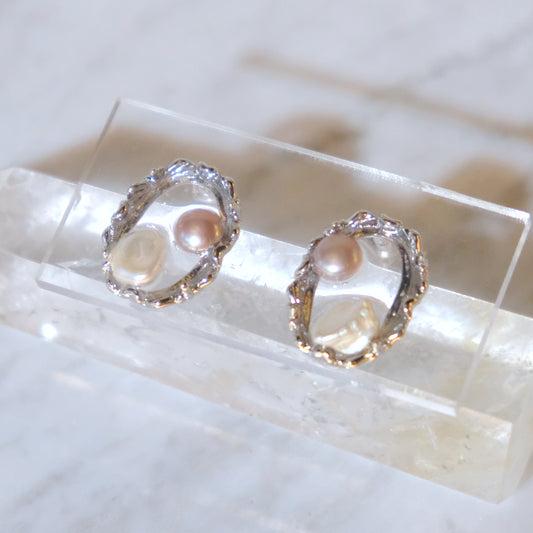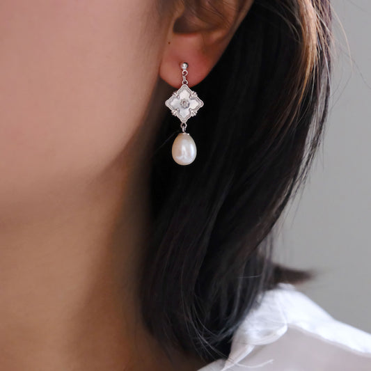 [ Classic ] 婚禮 銀色菱形花邊天然貝母 極光炫彩淡水珍珠耳環/耳夾 E332