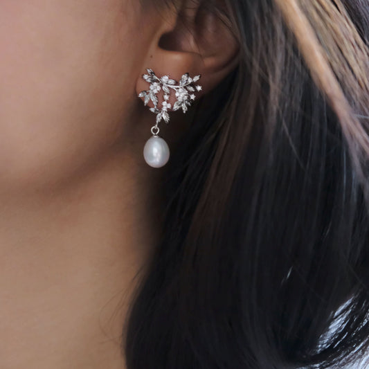婚禮 [ 唯一守護的愛 ] 山楂花 極光炫彩淡水珍珠 銀色耳環 E364