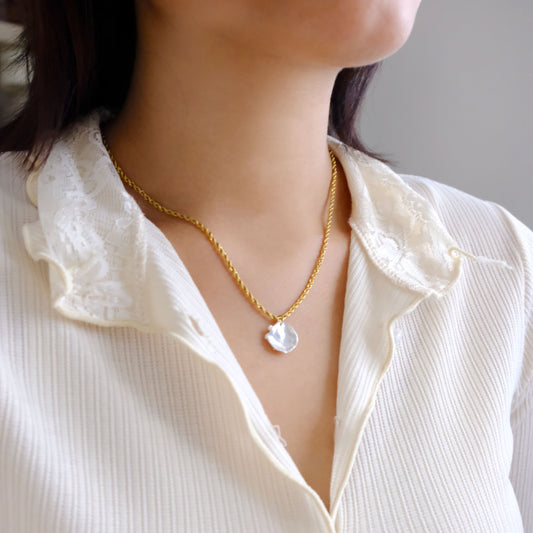 百撘歐美款 KESHI無核花瓣珍珠 扭麻花粗鏈 防敏感不掉色鈦鋼頸鏈 N179