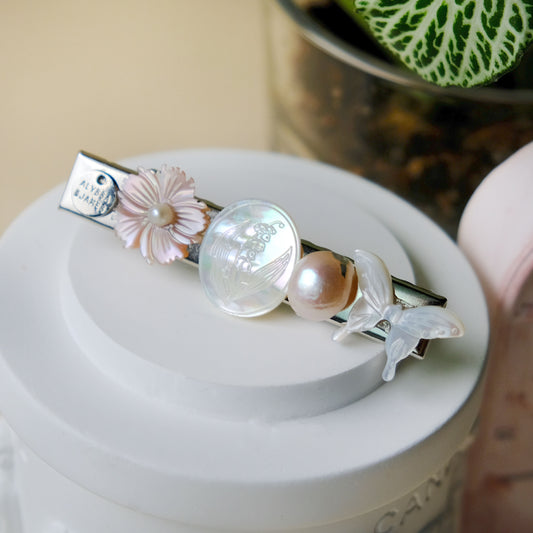 [ 蛻變的黑蝴蝶與幸福鈴蘭 ] 淡水珍珠貝母髮夾 H125
