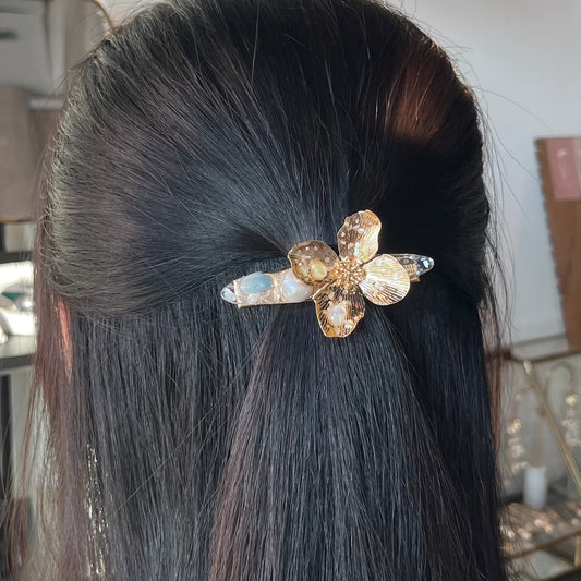 金花 淡水珍珠 貝母 水晶 髮夾 H130