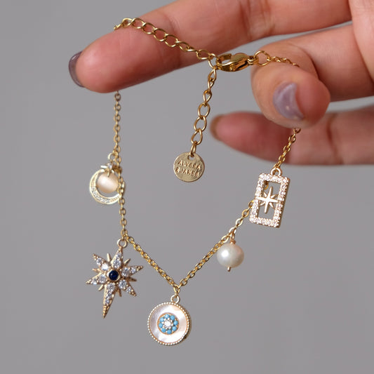 [ 惡魔之眼 ] 貝母 貓眼石月亮 淡水珍珠 星辰手鏈 B122